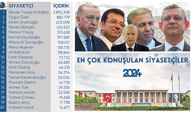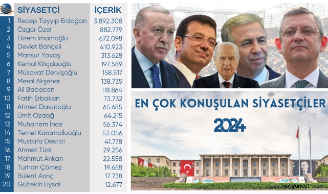 İşte 2024’te en çok konuşulan siyasetçiler:Recep Tayyip Erdoğan (RTE): 3 milyon 892 bin 308 içerik ile en çok konuşulan siyasetçi oldu. Cumhurbaşkanı Erdoğan, hem iç hem de dış politikadaki etkinliği ile yıl boyunca medyanın odağında yer aldı. Özellikle CHP ile “yumuşama süreci”, ekonomi politikaları, Suriye gibi dış politika hamleleri ve yerel seçimler gibi konular Erdoğan'ın medyada sıkça yer almasını sağladı.Özgür Özel: 882 bin 779 içerik ile en çok konuşulan ikinci siyasetçi oldu. CHP Genel Başkanı Özgür Özel, Genel başkanlık yarışında öne çıkması, parti içi dinamiklere karşı tutumu ve muhalefet politikaları ile dikkat çekti. Özel, AK Parti ile başlatılan “yumuşama süreci” ile de medyada geniş yer buldu.Ekrem İmamoğlu: 672 bin 98 içerik ile üçüncü sırada yer aldı. İstanbul Büyükşehir Belediye Başkanı İmamoğlu, hem yerel yönetim çalışmaları ve sosyal projeleri hem de hakkında süren davanın gölgesinde konuşulan siyasi geleceği ile ilgili spekülasyonlarla gündeme geldi. İmamoğlu'nun, İstanbul'da gerçekleştirdiği çeşitli altyapı projeleri ve olası Cumhurbaşkanlığı adaylığı da medyanın ilgisindeydi.Devlet Bahçeli: 410 bin 923 içerik ile dördüncü sırada yer aldı. MHP Genel Başkanı Bahçeli, hükümetteki rolü ve parti politikaları ile medyanın ilgisini çekti. Bahçeli'nin, Ferdi Tayfur göndermeli klipleri, yüzüklü ve dosyalı postları, terör örgütü lideri Abdullah Öcalan’ın DEM Grubu’nda konuşturulmasına yönelik çağrıları ve hükümetin kritik kararlarında oynadığı rol, yıl boyunca medyada sıkça tartışıldı.Mansur Yavaş: 313 bin 628 yayın ile listenin beşinci sırasında yer aldı. Ankara Büyükşehir Belediye Başkanı Yavaş, özellikle başkentteki projeleri ve yönetim tarzı ile öne çıktı. Cumhurbaşkanlığı yarışındaki adaylık anketleriyle sık sık gündeme gelen Yavaş'ın, Ankara'da hayata geçirdiği altyapı projeleri ve sosyal politikaları medyada geniş yer buldu.Kemal Kılıçdaroğlu: 197 bin 589 içerikle altıncı sırada yer aldı. Genel başkanlıktan ayrılmasına rağmen, Ankara’da açtığı ofis ile siyasete ara vermeden devam etti. CHP Eski Genel Başkanı Kılıçdaroğlu, dönem dönem Cumhurbaşkanı Erdoğan’ı direkt muhatap alarak sosyal medya veya basın aracılığıyla yaptığı çıkışlarla medyada çokça konuşuldu.Müsavat Dervişoğlu: 158 bin 517 içerik ile en çok konuşulan yedinci siyasetçi oldu. 31 Mart Yerel Seçimleri’nden sonraki kurultayda İYİ Parti Genel Başkanlığı’nı kazanan Dervişoğlu, grup toplantısında Devlet Bahçeli’ye attığı ip ile akıllara kazındı. İç ve dış politikalarla ilgili olarak Cumhurbaşkanına ve Bahçeli’ye yönelik sert söylemleriyle basında geniş yer buldu. Meral Akşener: 138 bin 735 içerik ile en çok konuşulan sekizinci siyasetçi oldu. İYİ Parti’nin 31 Mart Yerel Seçimleri’nin sonrasında gerçekleştirilen kurultayında genel başkanlığı devretti. Akşener'in, genel başkanlığı bırakmasının ardından medyada, siyasette nasıl bir rol üstleneceği konusunda yoğun bir spekülasyon yapıldı. Akşener, Cumhurbaşkanı Erdoğan ile Beştepe’de yaptığı görüşme sonrası başlayan kulis iddialarıyla da basında geniş yer aldı.Ali Babacan: 118 bin 864 içerikle dokuzuncu sırada yer aldı. Altılı Masa’nın dağılması sonrası dönemde de eleştirilerine hız kesmeden devam eden Babacan'ın ekonomik reform önerileri yıl boyunca medyanın ilgi odağına yerleşti.Fatih Erbakan: 73 bin 732 yansıma ile en çok konuşulan onuncu siyasetçi oldu. Özellikle Filistin odaklı söylemleriyle öne çıkan Erbakan, 31 Mart Yerel Seçimleri’nde Yeniden Refah Partisi oylarında beklenenden yüksek bir oran yakalaması ile de medyada yer buldu.