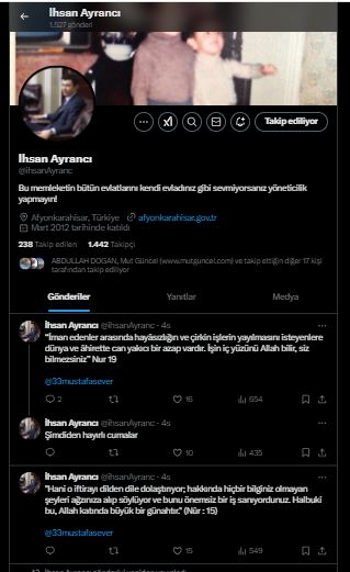 Vali Yardımcısı İhsan Ayrancı'nın yaptığı x (eski twitter) hesabından yaptığı paylaşımları şöyle: "İhsan Ayrancı @ihsanAyranc⚫ 3s"İman edenler arasında hayâsızlığın ve çirkin işlerin yayılmasını isteyenlere dünya ve âhirette can yakıcı bir azap vardır. İşin iç yüzünü Allah bilir, siz bilmezsiniz” Nur 19@33mustafasever"