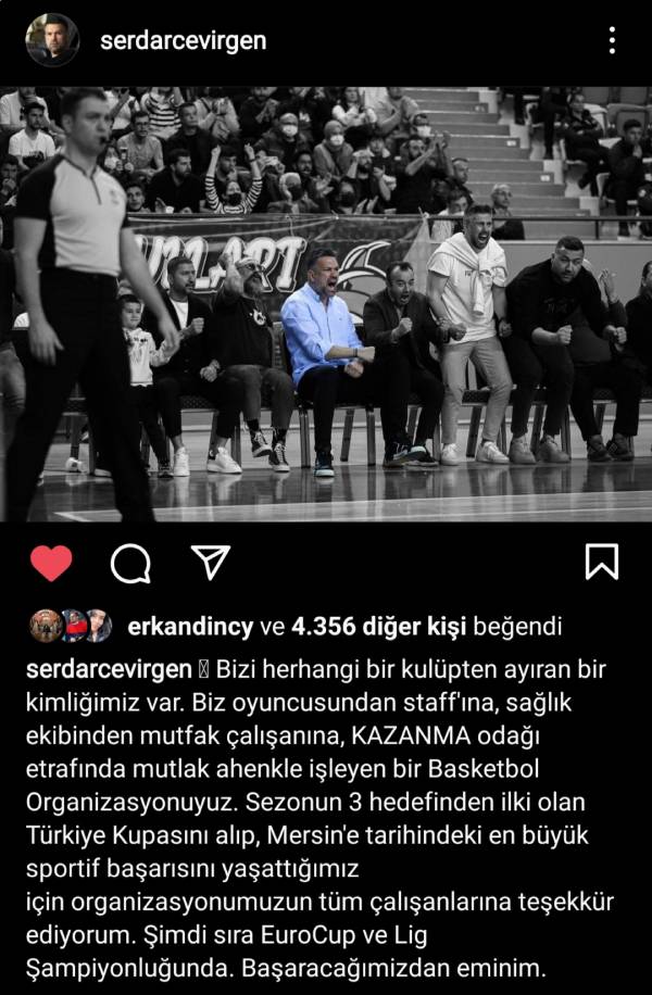 Başkan Çevirgen, tarihi şampiyonluğun ardından sosyal medya hesabında bir mesaj yayınladı. Çukurova Basketbol'u diğer kulüplerden ayıran bir kimliğinin bulunduğunu belirten Çevirgen, mesajında; "Biz oyuncusundan staffına, sağlık ekibinden mutfak çalışanına, kazanma odağı etrafında mutlak ahenkle işleyen bir basketbol organizasyonuyuz. Sezonun 3 hedefinden ilki olan Türkiye Kupası'nı alıp, Mersin'e tarihindeki en büyük sportif başarısını yaşattığımız için organizasyonumuzun tüm çalışanlarına, taraftarlarımıza ve bizi destekleyen herkese teşekkür ediyorum. Şimdi sıra EuroCup ve lig şampiyonluğunda. Başaracağımızdan eminim" ifadelerine yer verdi.