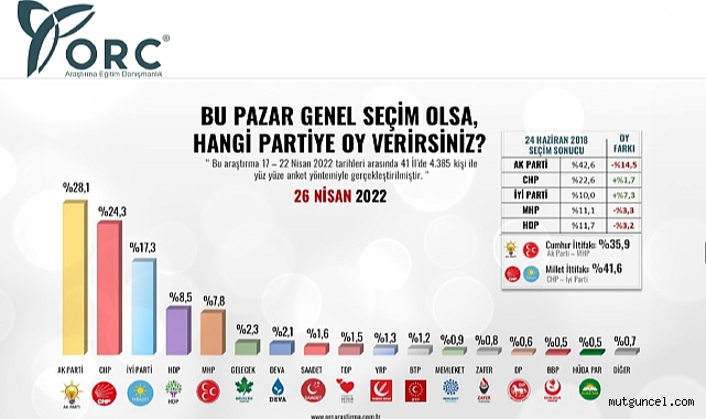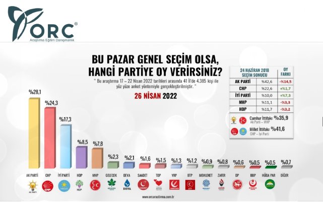 ORC Araştıma "Bu Pazar seçim olsa" araştırması yaptı. Araştırma 5 - 8 Mayıs 2022 tarihleri arasında 41 İl'de toplam 5.300 katılımcıyla Yüz Yüze anket yöntemi ile gerçekleştirildi. Araştırmada: AkParti %28,0