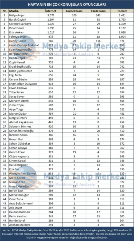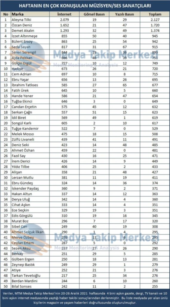 Yaşam Yayınlanma: 27 Aralık 2021 - 11:48 Haftanın en çok konuşulanları MTM Medya Takip Merkezi, 20-26 Aralık 2021 haftasının en çok konuşulan Oyuncu, Müzisyen - Ses Sanatçıları ve dizileri araştırdı. Yaşam 27 Aralık 2021 - 11:48 Yorumlar Dinle Yazdır A Büyüt A Küçült Yorumlar # Medya Takip Merkezi# oyuncu# sanatçı# ses# dizi# MTM# TV YORUMLAR adlı kullanıcıya cevap x Gönder ANASAYFAYA DÖNMEK İÇİN TIKLAYINIZ İlginizi Çekebilir Saadet Partisi, Mut'ta iftar kumanyası dağıttı Başka Seçer ve Meral Seçer, Mut halkıyla İftar Sofrası'nda buluştu Mali müşavirlerden türkü dolu gece ‘Eşit Mersin’in Emekçi Kadınları’ 8 Mart’ta bir araya geldi Son Haberler Kaymakam'dan okul ziyaretleri Mersin'de uyuşturucu operasyonu Fatma Çelik Kovan'dan Mut TSO'ya öneriler Mut TSO binasının temeli atıldı 'Kadın Dostu Kentler' için 25 belediye birlikte çalışıyor Dar gelirliye kıyafet desteği Dar gelirliye kıyafet desteği