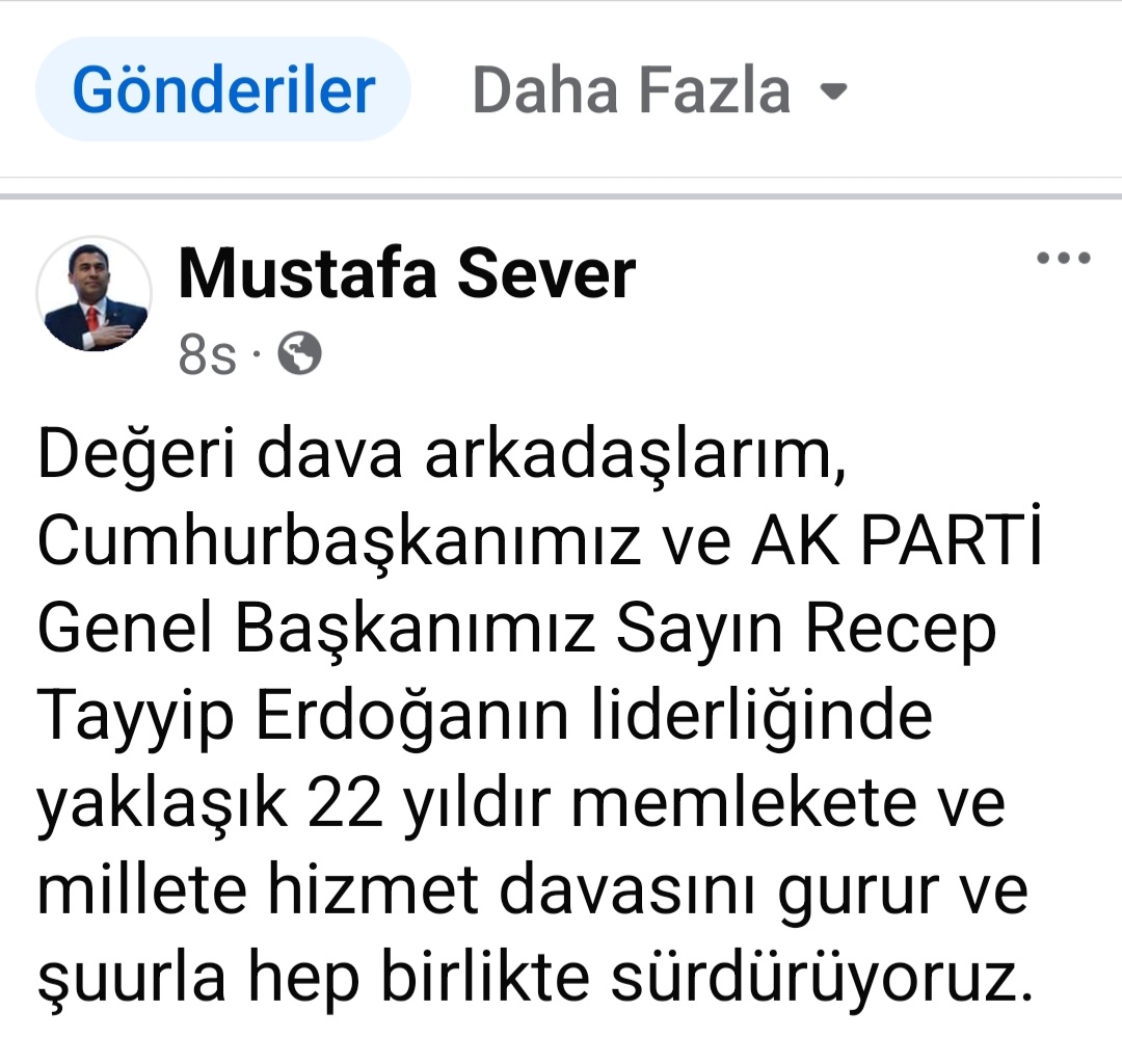 "Değeri dava arkadaşlarım, Cumhurbaşkanımız ve AK PARTİ Genel Başkanımız Sayın Recep Tayyip Erdoğanın liderliğinde yaklaşık 22 yıldır memlekete ve millete hizmet davasını gurur ve şuurla hep birlikte sürdürüyoruz. Memleket ve millet sevdamızın esası olan davaya hizmeti, bir nöbet anlayışı içersinde sürdürmek her zaman en temel esasımız olmuştur. Önemli olan bir mevki ya da makamı isgal etmek değil, gelinen makama değer katmak, bunu hizmet vesilesi olarak bir emanet olarak görmek ve görev sona erdikten sonra da bir nefer olarak davaya hizmete devam edebilmektir. Bu çerçevede görevlerini devreden Mezitli ilçe başkanımız Zafer Uslu’ya, Erdemli ilçe başkanımız Serdal Kaya’ya ve Mut ilçe başkanımız Fatih Ünver’e teşekkür ediyorum. Yeni göreve atanan Mezitli İlçe başkanımız Hüseyin Kılıç’a, Erdemli ilçe başkanımız Ali Mustafa Poş’a ve Mut ilçe başkanımız Adem Çopur’a görevlerinde başarılar diliyorum. Türkiye Yüzyılı vizyonu içerisinde Cumhurbaşkanımız Sayın Recep Tayyip Erdoğan’ın liderliğinde hep birlikte sürdüreceğimiz memlekete ve millete hizmet davamızda Allah yar ve yardımcımız olsun. Selam ve hürmetlerimle.Mustafa SeverAK PARTİ MKYK Üyesi"