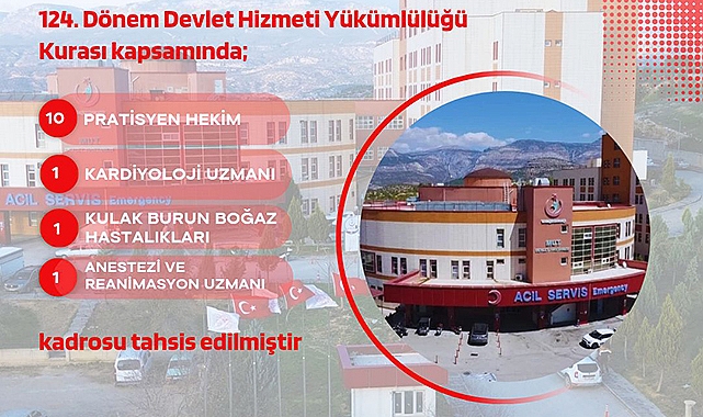 "Sağlık Bakanlığımızın ve İl Sağlık Müdürlüğümüzün destekleriyle, hastanemizin sağlık hizmeti kapasitesini güçlendirmek amacıyla yürütülen çalışmalar sonucunda 124. Dönem Devlet Hizmeti Yükümlülüğü Kurası kapsamında;