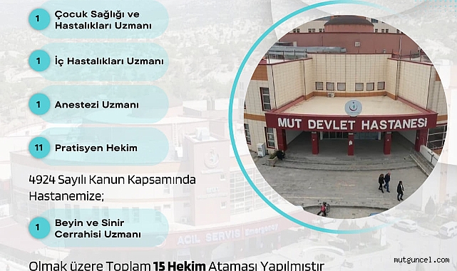 Mut Devlet Hastanesi tarafından sosyal medya hesapları üzerinden yapılan açıklama şöyle:"Nitelikli sağlık hizmeti sunabilmek amacıyla her geçen gün gelişen ve büyüyen hastanemize, Sağlık Bakanlığımızın ve Mersin İl Sağlık Müdürlüğümüzün destekleriyle "118. Devlet Hizmet Yükümlülüğü Ataması" kapsamında ve "4924 sayılı kanuna tabi yerleştirme işlemi" sonucunda:1 Beyin ve Sinir Cerrahisi Uzmanı1 Anestezi Uzmanı1 İç Hastalıkları Uzmanı1 Çocuk Sağlığı ve Hastalıkları Uzmanı11 Pratisyen Hekimolmak üzere 15 Hekim ataması yapılmıştır.İlgili takvime göre yakın zamanda görevlerine başlayacaklardır.Bu süreçte emeği geçen herkese teşekkür eder, atamaların ilçemize ve bölgemize hayırlı olmasını dileriz."