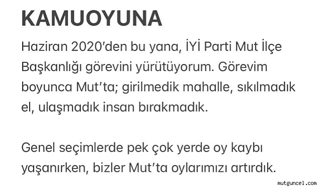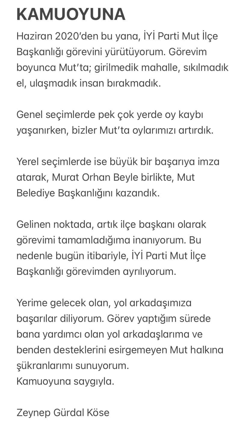 Zeynep Gürdal Köse'nin "Kamuoyuna" başlığıyla sosyal medyada yaptığı paylaşımında şu sözlere yer verdi: "KAMUOYUNA Haziran 2020'den bu yana, İYİ Parti Mut İlçe Başkanlığı görevini yürütüyorum. Görevim boyunca Mut'ta; girilmedik mahalle, sıkılmadık el, ulaşmadık insan bırakmadık.Genel seçimlerde pek çok yerde oy kaybı yaşanırken, bizler Mut'ta oylarımızı artırdık.Yerel seçimlerde ise büyük bir başarıya imza atarak, Murat Orhan Beyle birlikte, Mut Belediye Başkanlığını kazandık.Gelinen noktada, artık ilçe başkanı olarak görevimi tamamladığıma inanıyorum. Bu nedenle bugün itibariyle, İYİ Parti Mut İlçe Başkanlığı görevimden ayrılıyorum.Yerime gelecek olan, yol arkadaşımıza başarılar diliyorum. Görev yaptığım sürede bana yardımcı olan yol arkadaşlarıma ve benden desteklerini esirgemeyen Mut halkına Şükranlarımı sunuyorum. Kamuoyuna saygıyla.Zeynep Gürdal Köse"