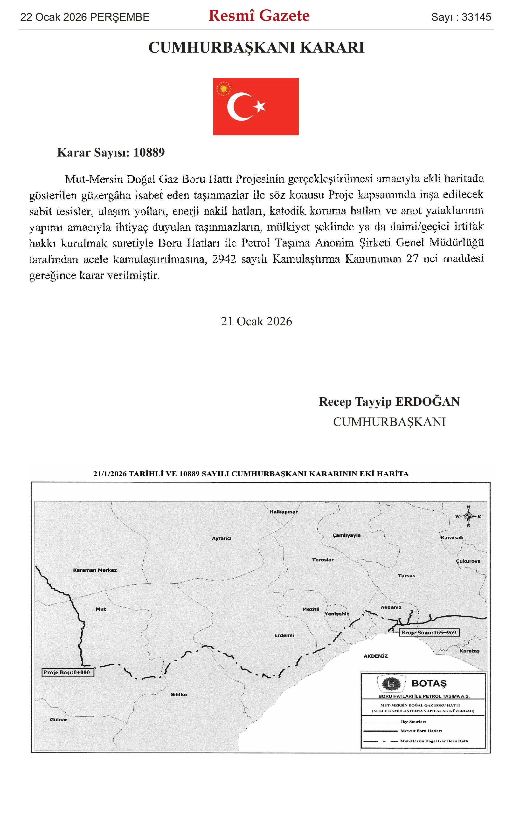 22 Ocak 2026 Perşembe tarih ve 33145 Sayılı Resmi Gazete'de yayınlanan 10889 Sayılı Cumhurbaşkanlığı kararına göre;