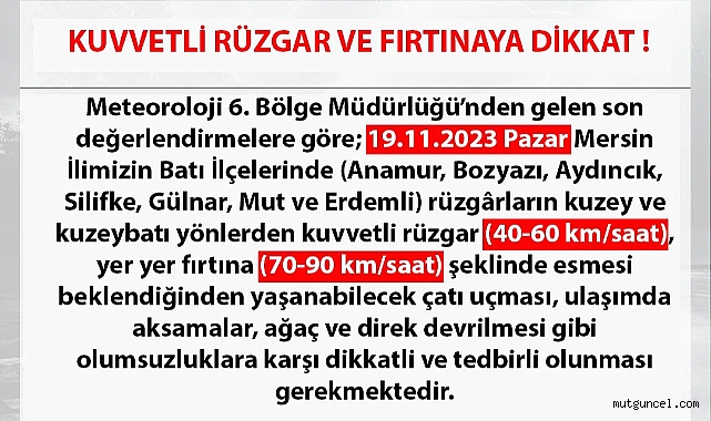 Meteorolojinin uyarısı şöyle:Mersin’in Batı İlçelerinde Kuvvetli rüzgar ve Fırtınaya Dikkat! 19.11.2023 17.00Çatı UçmasıUlaşımda AksamalarAğaç ve Direk Devrilmesigibi olumsuzluklara karşı vatandaşlarımızın tedbirli ve dikkatli olması önem arz etmektedir.