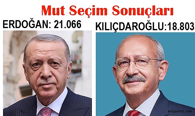 14 Mayıs 2023 Mut seçim sonuçlarıCumhurbaşkanlığı Seçimi sonuçları:Recep TayyipP Erdoğan : 21.066Muharrem İnce : 338Kemal Kılıçdaroğlu : 18.803Sinan Oğan : 2.761Milletvekilliği Sonuçları:Millet Partisi : 39Hak ve Özgürlükler partisi : 59Türkiye Komünist Partisi : 30Türkiye Komünist Hareketi : 15Sol Parti : 21Genç Parti : 70Memleket Partisi : 372Büyük Birlik Partisi : 400Adalet ve Kalkınma Partisi : 13.299Yeniden Refah Partisi : 423Milliyetçi Hareket Partisi : 7.468Yeşiller ve Sol Gelecek Partisi : 147Türkiye İşçi Partisi : 234Adalet Birlik Partisi : 80Yenilik Partisi : 7Halkın Kurtuluş Partisi : 41Vatan Partisi : 38Güç Birliği Partisi : 36Cumhuriyet Halk Partisi : 12.486İyi Parti : 6.555Adalet Partisi : 144Zafer Partisi : 868