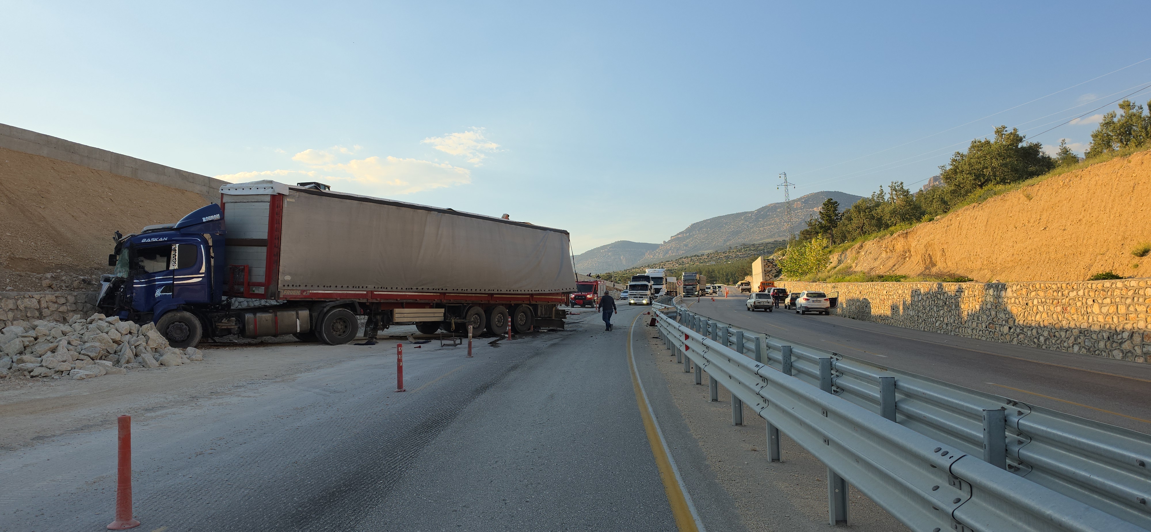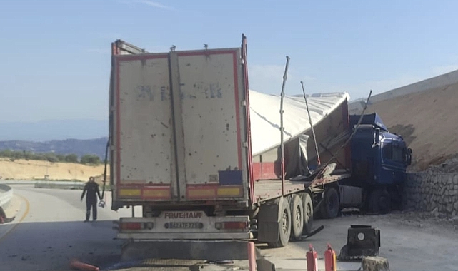 Karaman istikametinden Mut yönüne gelen Y.G.'nin kullandığı 42 AZN 478 plakalı ham mermer taşı yüklü TIR, yapımı devam eden işçilerin çalıştığı kaçış rampasının istinat duvarına çarptı.