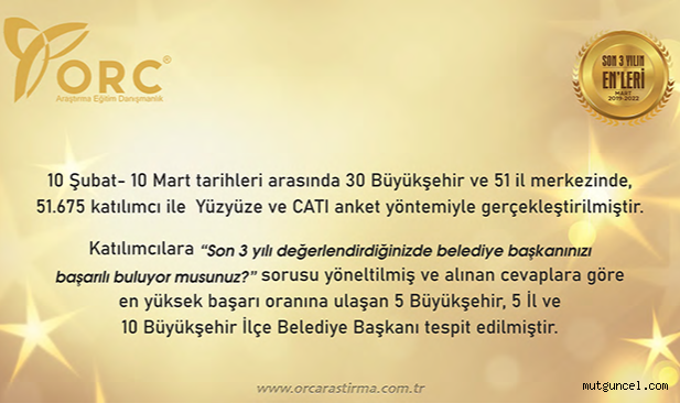 10 Şubat- 10 Mart tarihleri arasında 30 Büyükşehir ve 51 il merkezinde, 51.675 katılımcı ile Yüzyüze ve CATI anket yöntemiyle gerçekleştirilmiştir. Katılımcılara "Son 3 yılı değerlendirdiğinizde belediye başkanınızı başarılı buluyor musunuz?" sorusu yöneltilmiş ve alınan cevaplara göre;
