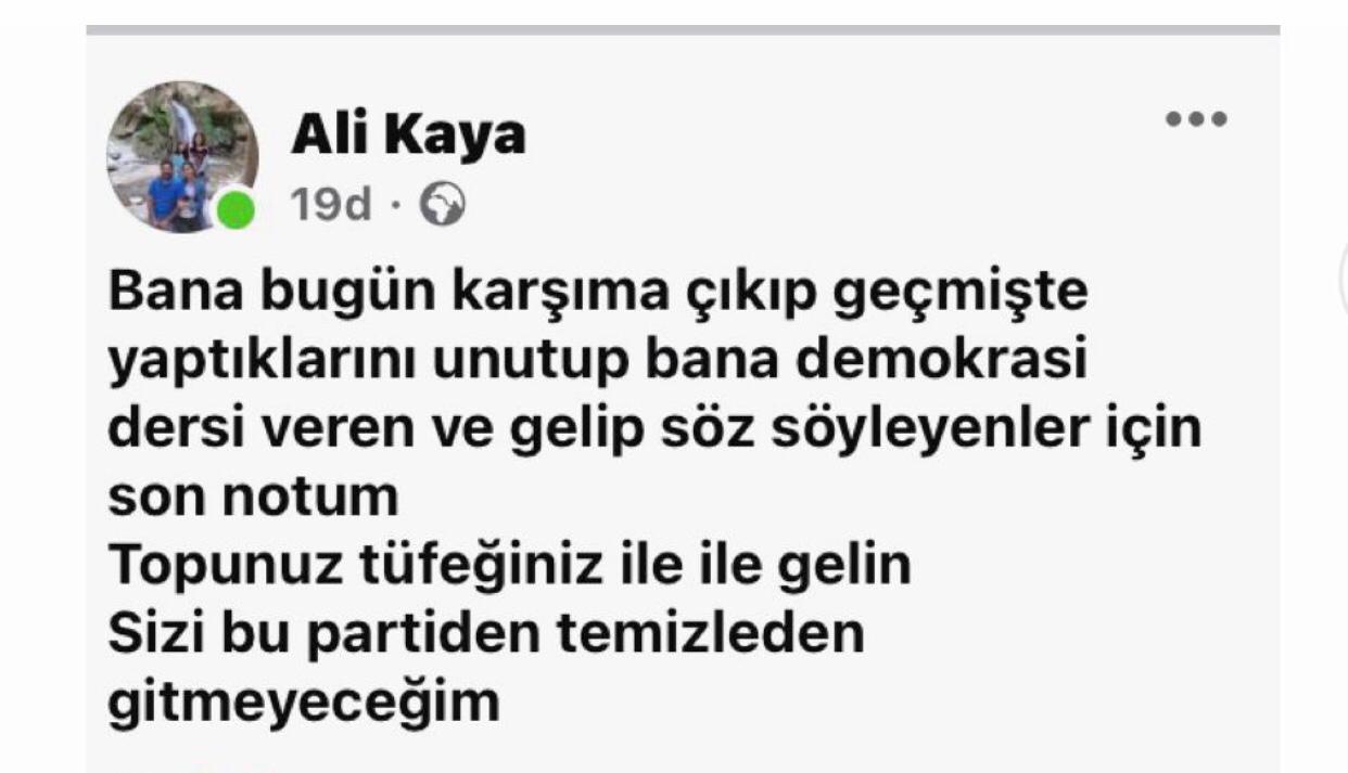 Belediye Meclis Üyelerinin ön seçimle belirlenmesi tartışmaları sonucunda bir kaç aday adayının adaylıktan çekildiklerini ifade etmelerinin ardından İlçe Başkanı Ali Kaya'nın sosyal medya üzerinde ayar vermeye kalkması da yadırganıyor. Parti içi tartışmaları üstelik birleştirici ve bütünleştirici bir görevi olması gereken başkanın, "Topunuz tüfeğiniz ile ile gelin. Sizi bu partiden temizleden gitmeyeceğim" (Yazım hataları kendisine aittir) diye yazması nasıl bir ruh halidir?